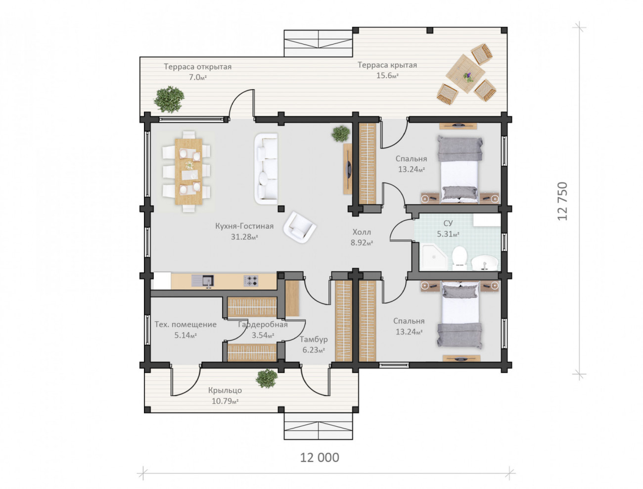 В одной из спален предусмотрен выход на крытую часть террасы.