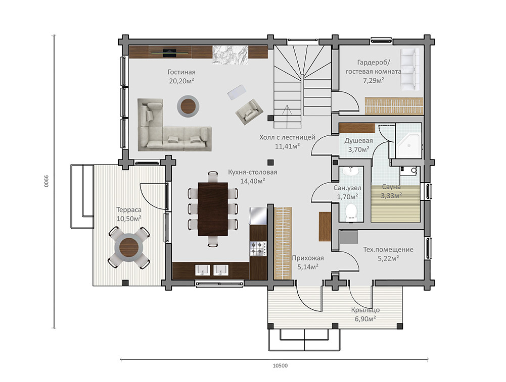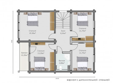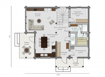 На первом этаже запланирована небольшая кухня-столовая с выходом на террасу, гостиная площадью 20 кв. м., сауна, санузел, техническое помещение и прихожая. На втором этаже предусмотрены ванная комната и три, либо четыре спальни. в зависимости от вашего выбора планировки.