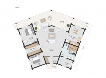 Прихожая в этом доме обеспечивает проход в просторную, хорошо освещенную гостиную с панорамными окнами и видом на большую террасу. Из гостиной можно попасть в любую из комнат дома.
